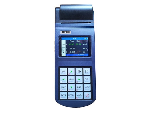 GV300 uses piezoelectric acceleration transducer to convert vibration signal into electric signal. Then by analyzing input signal, results including RMS of velocity values, peak-peak value of displacement, peak values of acceleration or real-time spectral charts are displayed or printed out. It can not only measure the three parameters, but also for rotational speed measuring.